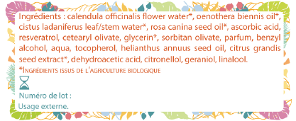 Hydrolat de calendula*, huile végétale d'onagre*, hydrolat de ciste ladanifère*, huile végétale de rose musquée*, émulsifiant, acide ascorbique (vitamine C pure), actif resvératrol, glycérine végétale*, fragrance naturelle de rose, conservateurs.